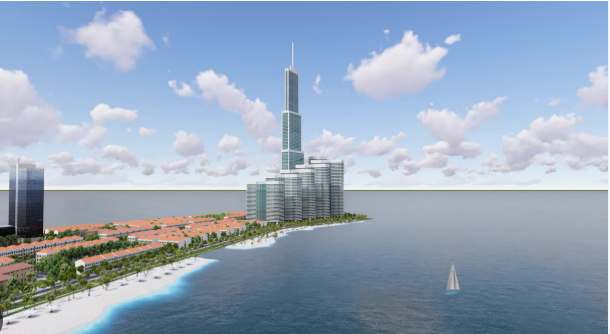 Ảnh phối cảnh Tòa tháp biểu tượng 108 tầng tại dự án Vinhomes Green Paradise Cần Giờ, một yếu tố gia tăng giá trị bất động sản.