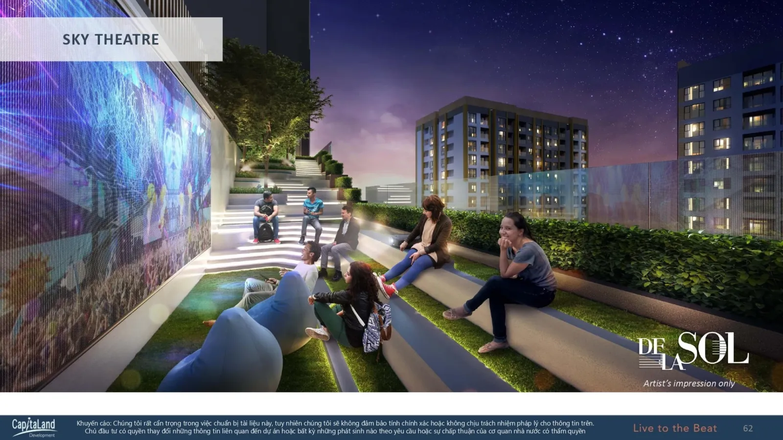 Chủ đầu tư CapitaLand Vietnam cam kết đem đến cho cư dân một cuộc sống tiện nghi và đầy đủ với hệ thống tiện ích nội khu đẳng cấp, bao gồm hồ bơi tràn, phòng gym, khu vui chơi giải trí, vườn cây xanh và nhiều tiện ích khác. Đặc biệt, De La Sol còn có một môi trường sống đầy tính nghệ thuật với các thiết kế lấy cảm hứng từ âm nhạc, tạo nên một không gian sống đầy sáng tạo và năng động.