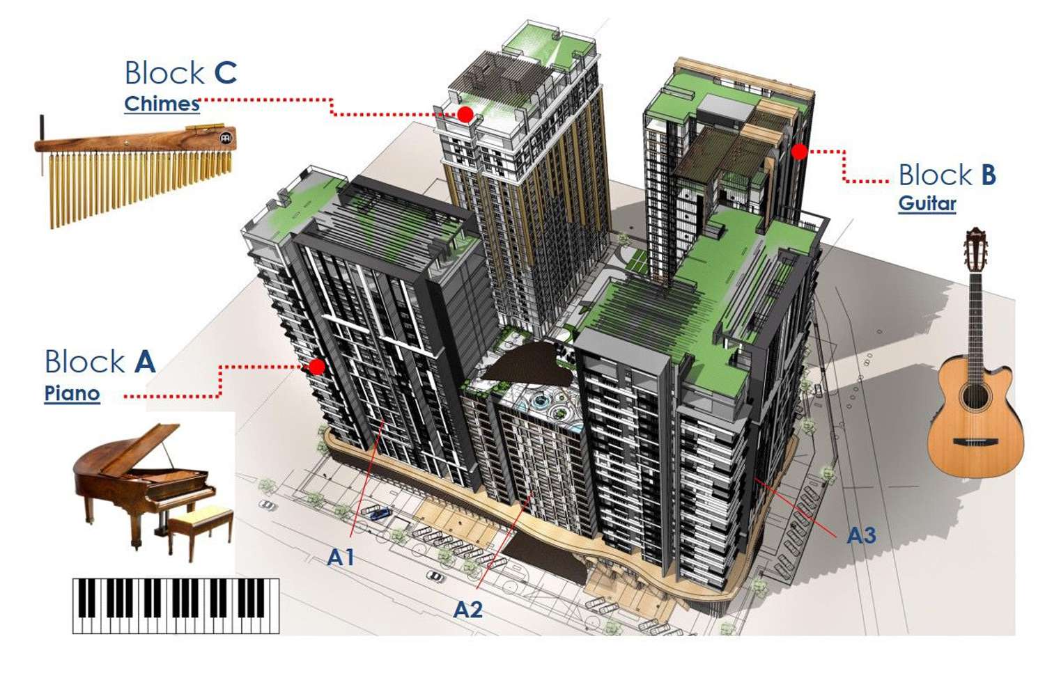 Không gian nghệ thuật: Các khu vực như vườn Piano, vườn Guitar, và vườn Chimes tạo điểm nhấn nổi bật, làm tăng giá trị thẩm mỹ của dự án.