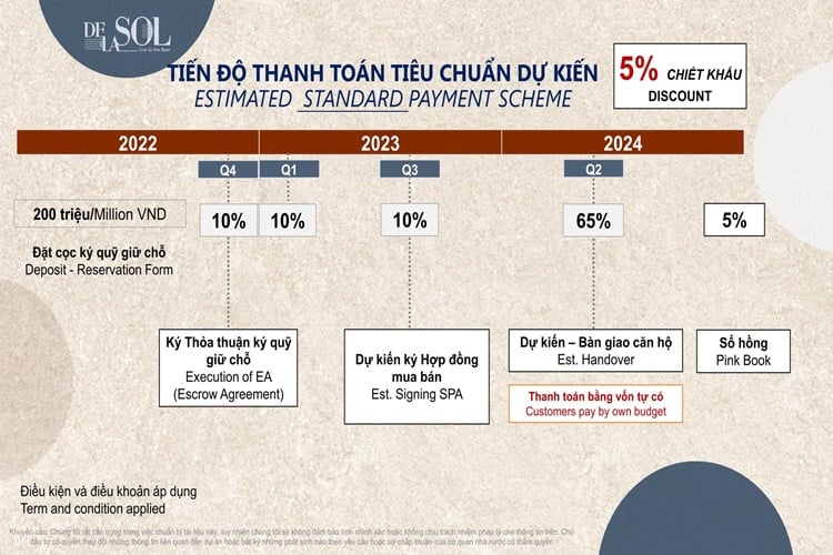 Tiến độ thanh toán De La Sol chuẩn được chủ đầu tư đưa ra mà khách hàng cùng nhà đầu tư có thể tham khảo như sau: