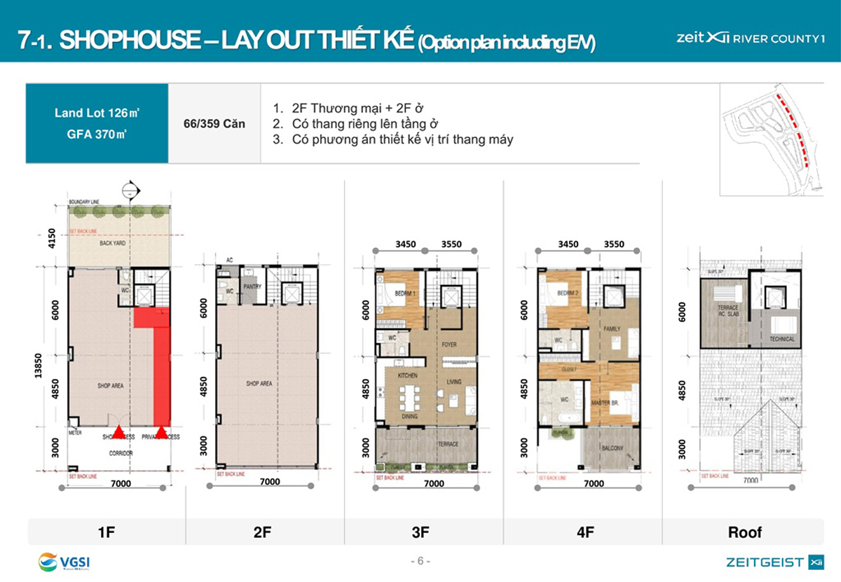 Shophouse: Các shophouse được thiết kế linh hoạt, vừa có thể dùng để ở vừa có thể kinh doanh. Tầng trệt dành cho các hoạt động thương mại, trong khi các tầng trên được thiết kế theo tiêu chuẩn căn hộ cao cấp, mang lại không gian sống thoải mái cho các chủ sở hữu.
